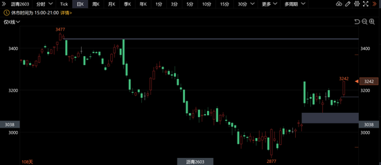 【1】盘面表现:BU 2603主力合约日内一路上行,强势拿下能源板块的涨幅最高。收盘价3242,较昨日收盘价+2.92%,盘中最高触及3242,最低3169。